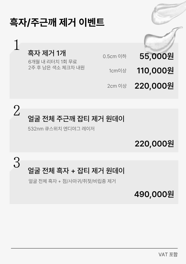 점/잡티/흑자 제거 거울 볼 때 마다 신경쓰이는점/편평사마귀/잡티/흑자 제거 점, 편평사마귀, 비립종, 흑자 잡티 제거 맑고 깨끗한 인상은 균일한 피부톤에서 시작됩니다.점, 잡티, 흑자는 크기와 깊이, 색소의 양상에 따라 치료 방식이 달라져야 합니다.본 클리닉은 개개인의 피부 상태를 세심하게 진단하여, 불필요한 자극은 줄이고 보다 정교한 색소 치료를 통해 한층 맑고 정돈된 피부로 개선해드립니다. Our Special 얼굴 전체 잡티 제거 얼굴과 목에 점점 늘어나는 편평사마귀 뿐만 아니라 점, 비립종, 쥐젖 등 얼굴 전체의 잡티를 갯수 제한 없이 섬세하게 제거 합니다 ※ 얼굴 전체 잡티 제거 비용은 아래에서 확인할 수 있습니다 정밀한 진단 점, 잡티, 흑자는 겉으로는 비슷해 보여도 색소의 깊이와 분포에 따라 치료 방법이 달라집니다. 본 클리닉에서는 야누스 프로 피부 진단 시스템을 통해 일반광, 편광, UV 촬영으로 보이지 않는 색소까지 분석한 후 각 병변에 맞는 맞춤 제거를 진행합니다. 정확한 진단을 바탕으로 불필요한 자극은 줄이고, 더욱 깔끔하고 안전한 결과를 목표로 합니다. 피부 손상 최소화 레이저 점, 잡티 제거에 사용되는 CO2 레이저는 병변 부위만 선택적으로 제거할 수 있는 정밀한 시술입니다. 본 클리닉에서는 필요 이상으로 깊게 제거하지 않고 피부 상태와 색소의 깊이에 맞춰 강도를 조절하여 주변 피부 손상을 최소화하는 것을 원칙으로 합니다. 이를 통해 회복은 빠르게, 흉터와 색소침착의 위험은 줄이는 치료를 진행합니다. 세심한 통증의 관리 레이저 시술이 걱정되는 이유 중 하나는 ‘통증’입니다. 본 클리닉은 시술 전 마취 연고를 통해 통증을 줄이고, 시술 과정에서도 피부 반응을 확인하며 섬세하게 진행합니다. 부담은 줄이고, 편안하게 받을 수 있는 시술을 지향합니다. 시술 시 주의사항 1주~2주 하얗게 진물이 나오지 않을 때까지재생밴드(듀오덤)을 붙여 주세요.시술 후 재생밴드(듀오덤)를 붙인 상태로가벼운 세안은 가능합니다. 듀오덤 알러지가 있는 경우or 듀오덤을 따로 붙이지 않는 경우에는후시딘(초반 3일)과 재생크림(3일 이후)으로관리해주세요.이때는 당일 세안은 불가능합니다. 듀오덤 제거 이후 재생크림과 선크림으로관리해야 흉터나 색소침착이 안생깁니다. 시술 후 일주일 정도 얼굴에 열과 땀이 나는찜질방, 사우나, 격한 운동, 음주 흡연을 피하세요.한 달 동안은 자외선을 피해주시고,외출시 자외선 차단제를 꼼꼼히 발라주세요. 점 제거 후 붉은 자국은 피부 타입에 따라1달 ~ 6달 정도 지속되며,시간이 지나면 옅어집니다. 기미 등 색소가 많은 경우에는갈색 자국이 생길 수 있으며,자국을 최소화 하기 위해서는선크림(무기자차)과 미백크림(트라넥삼산),재생크림(나이아신마이드)를잘 발라 주시면 좋습니다. 깊은 색소 점은 여러 번 나누어제거해야 흉터 없이 치료 가능합니다. Our Special 흑자 제거 흑자는 자외선과 노화로 인해 발생하는 색소 병변으로 경계가 뚜렷하고 짙은 갈색을 띠는 것이 특징입니다. 점과 달리 피부를 깎아내는 병변이 아니라 멜라닌 색소가 집중된 형태로, 색소 레이저 치료가 효과적입니다. 본 클리닉은 532nm 큐스위치 레이저를 이용하여 흑자 부위의 멜라닌 색소만 선택적으로 파괴합니다. 피부를 깎지 않고 색소만 타겟하기 때문에 1~2회 치료만으로 효과가 좋으며 주변 조직 손상을 최소화하면서 보다 자연스럽게 제거가 가능합니다. 시술 시 주의사항 재생밴드(듀오덤)은 2주까지 꼭 붙이고, 떨어지는 경우에도 위에 덧붙여 주세요. 2주간 잘 붙여야 회복이 잘됩니다. 2주 후 듀오덤 제거 및 남은 색소 확인차 내원해주세요. 시술 후 붉은기가 있는 경우는 리도맥스 등의 스테로이드 연고를 3일 정도만 소량 발라주세요. 이후 재생크림과 자외선 차단제를 잘 바르면서 관리해주세요. 시술 후 1달 간은 스크럽, 필링, 강한 각질 제거는 피해주세요. 딱지 떨어진 이후 색이 조금 진해보이는 것은 정상 반응이며, 레이저로 색소가 분해되면서 일시적으로 진해 보일 수 있습니다. 색소가 배출되는 과정이라 대부분 몇일 지나면 옅어집니다. 낮에 외출시에는 꼭 자외선 차단제(무기자차)를 발라주시고, 추가적으로 비타민 C 세럼을 사용하여 유해산소로부터 피부를 보호해주세요. 미백크림(트라넥삼산), 재생크림(나이아신마이드)를 사용해주시고, 색소가 많은 경우 도미나크림(히드로퀴논 4%)를 처음 1주일간 격일로 사용하며 피부 반응을 살펴주세요. 남은 색소가 있는 경우에는 3개월 이후, 6개월 이내 재시술을 한번 해드립니다. 관리가 잘 안되는 경우, 혹은 이미 피부에 색소가 많은 타입의 경우에는, 염증 후 색소침착이 생길 수 있으며, 이 경우에는 꼭 도미나크림을 사용하시는 것이 좋으며, 혹은 토닝 치료로 넘어가시는 것이 좋습니다. 자주 묻는 질문들 시술 시간은 얼마나 걸리나요 갯수에 따라 다르지만, 마취 포함 1시간~1시간 반 정도 소요됩니다. 시술 후 일상생활이 가능한가요? 네, 대부분의 경우 시술 직후부터 일상생활이 가능합니다. 다만, 듀오덤 부착 및 재생크림 사용을 반드시 해주셔야 합니다. 시술이 아픈가요? 시술 전 국